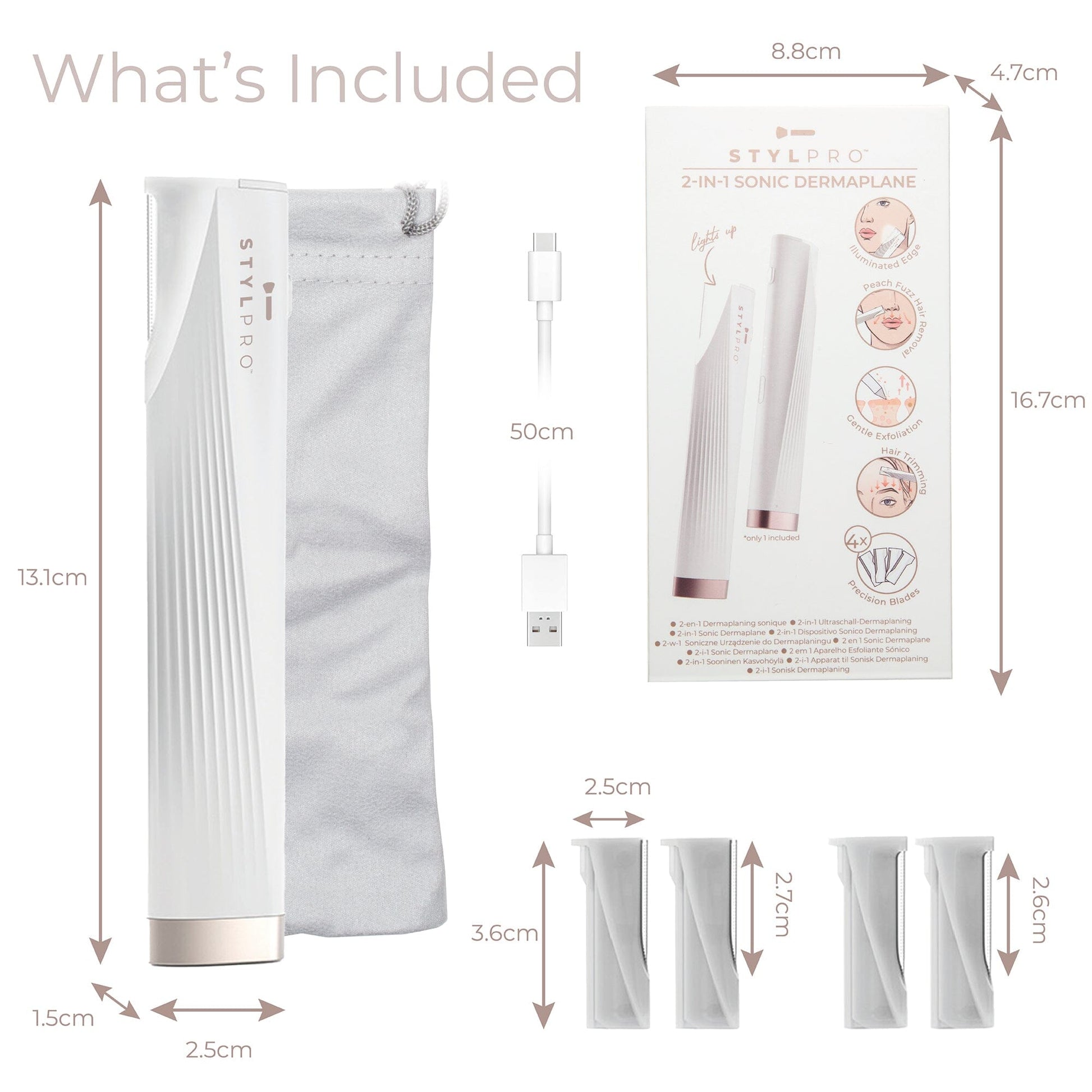 The STYLPRO Sonic Dermaplane comes with different blades to carter for various grooming needs: