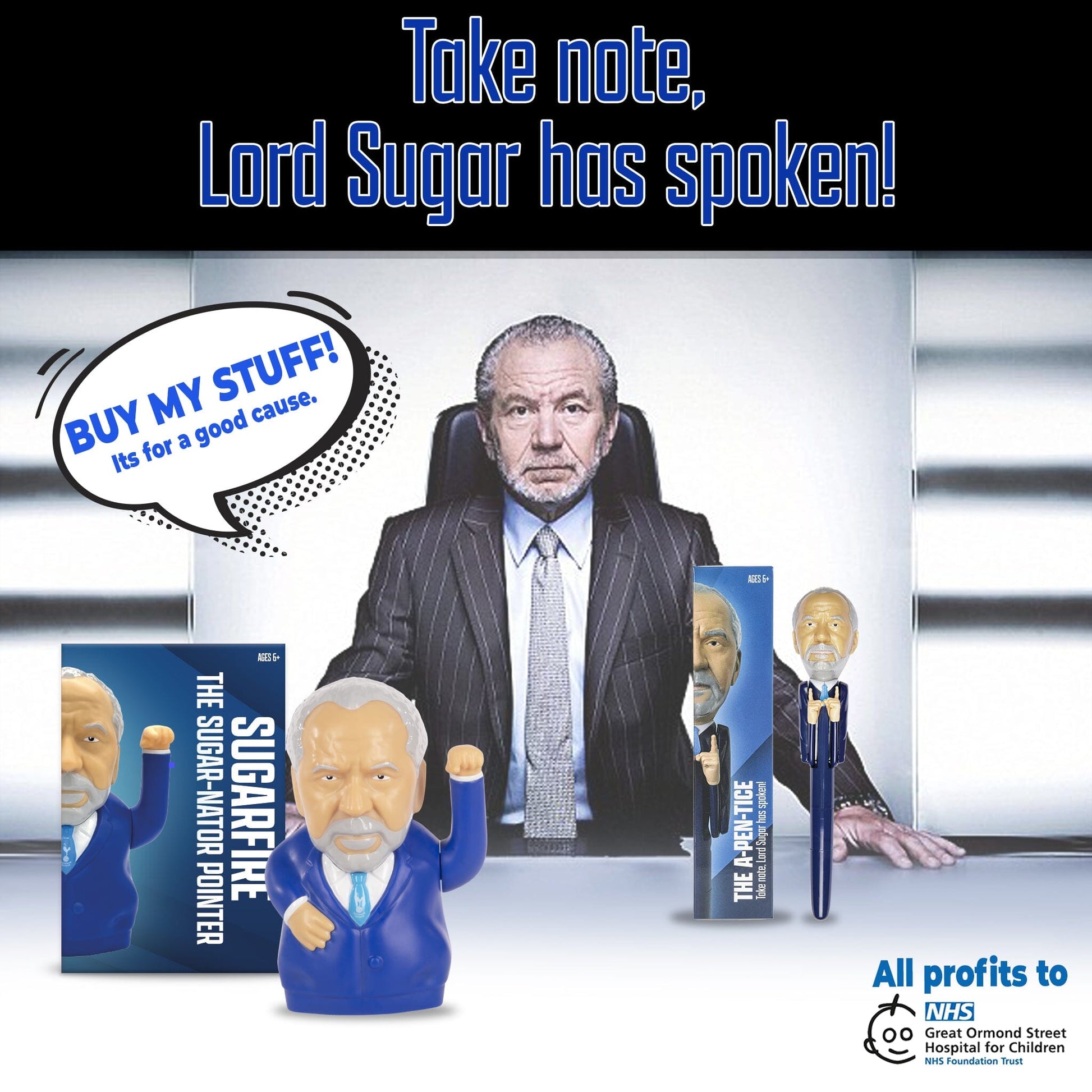 The SUGARFIRE Sugar-nator - Get fired by Lord Sugar every day with this unique desktop accessory. It sits perfectly on any desk or shelf, allowing Lord Sugar to wave his famous firing figure at you whenever you need a good talking to. Plus, all £15 proceeds go directly to Great Ormond Street Hospital, a charity Sir Alan cares deeply about.