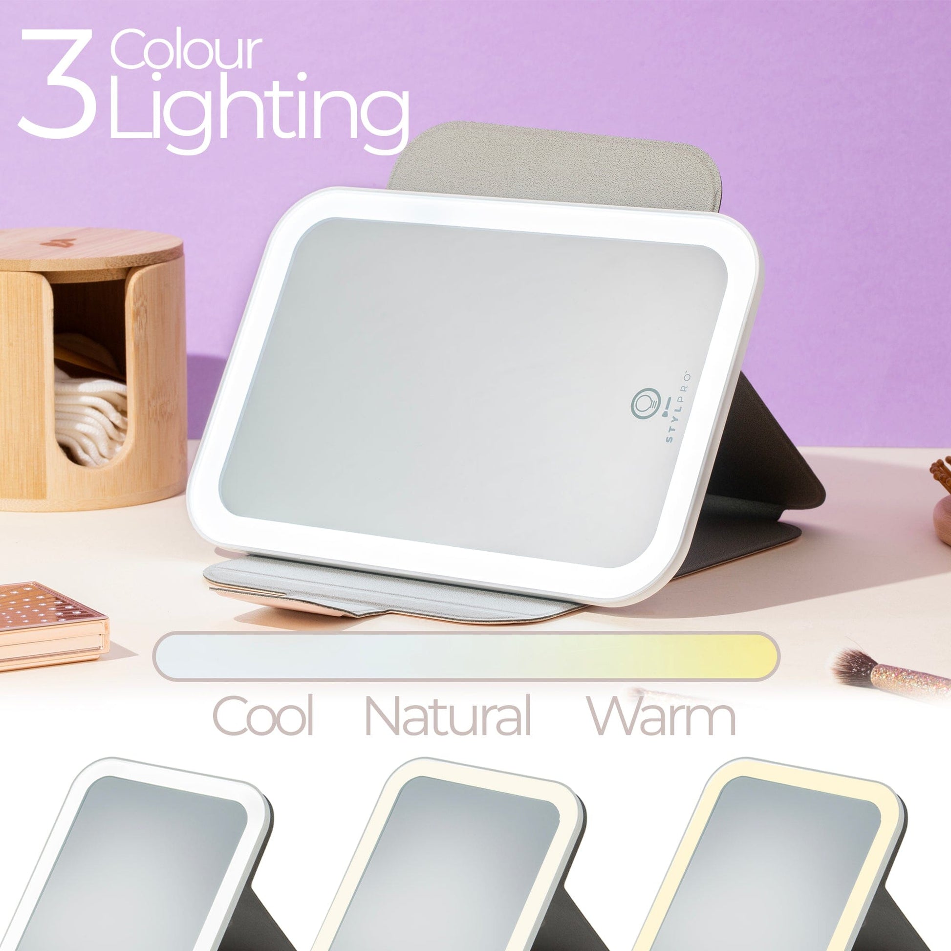 The On Tour Mirror has 3 light settings: Bright, Warm and Cool.