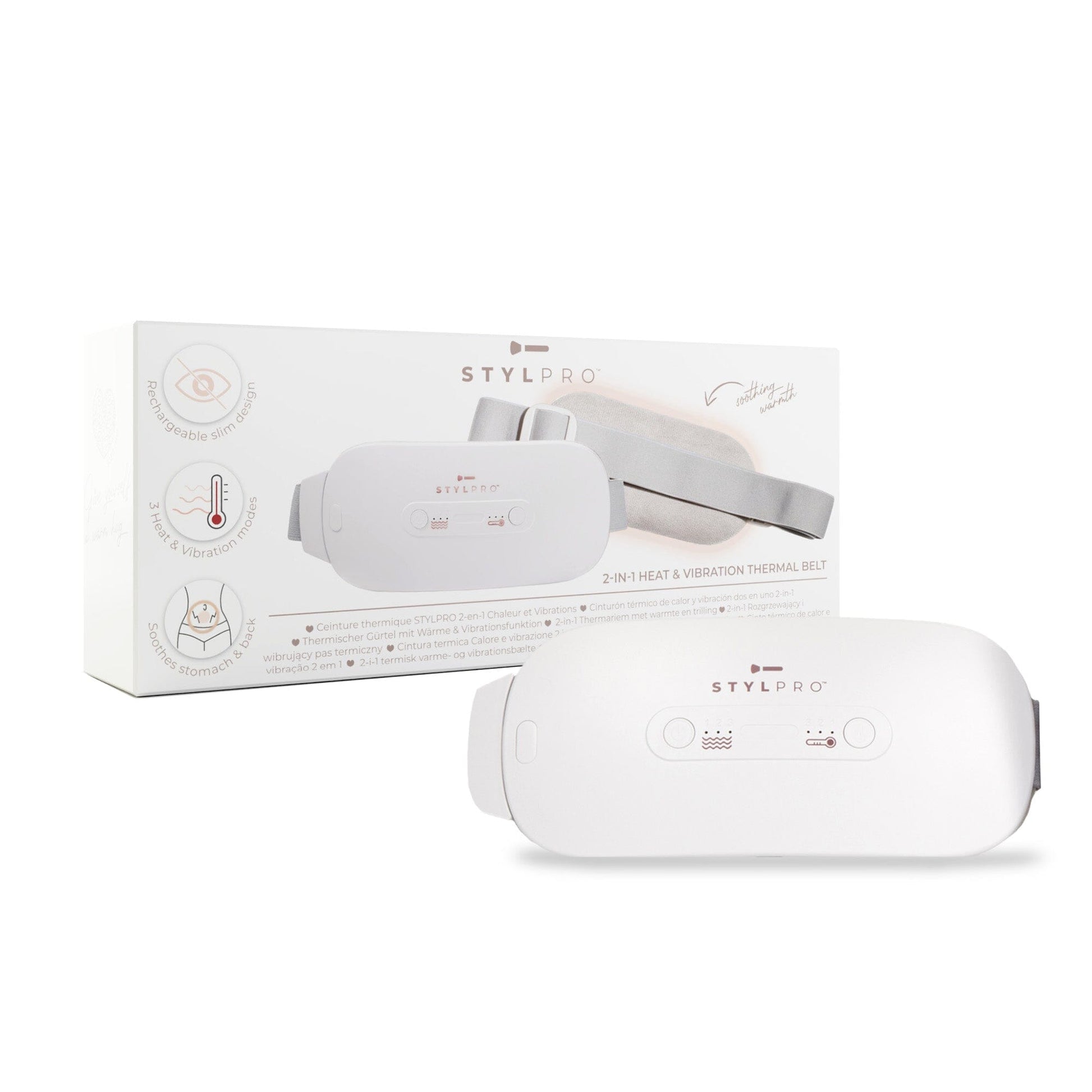 The STYLPRO Thermal Belt is your solution for natural, comforting relief. This wearable, rechargeable device offers soothing heat and gentle vibrations.